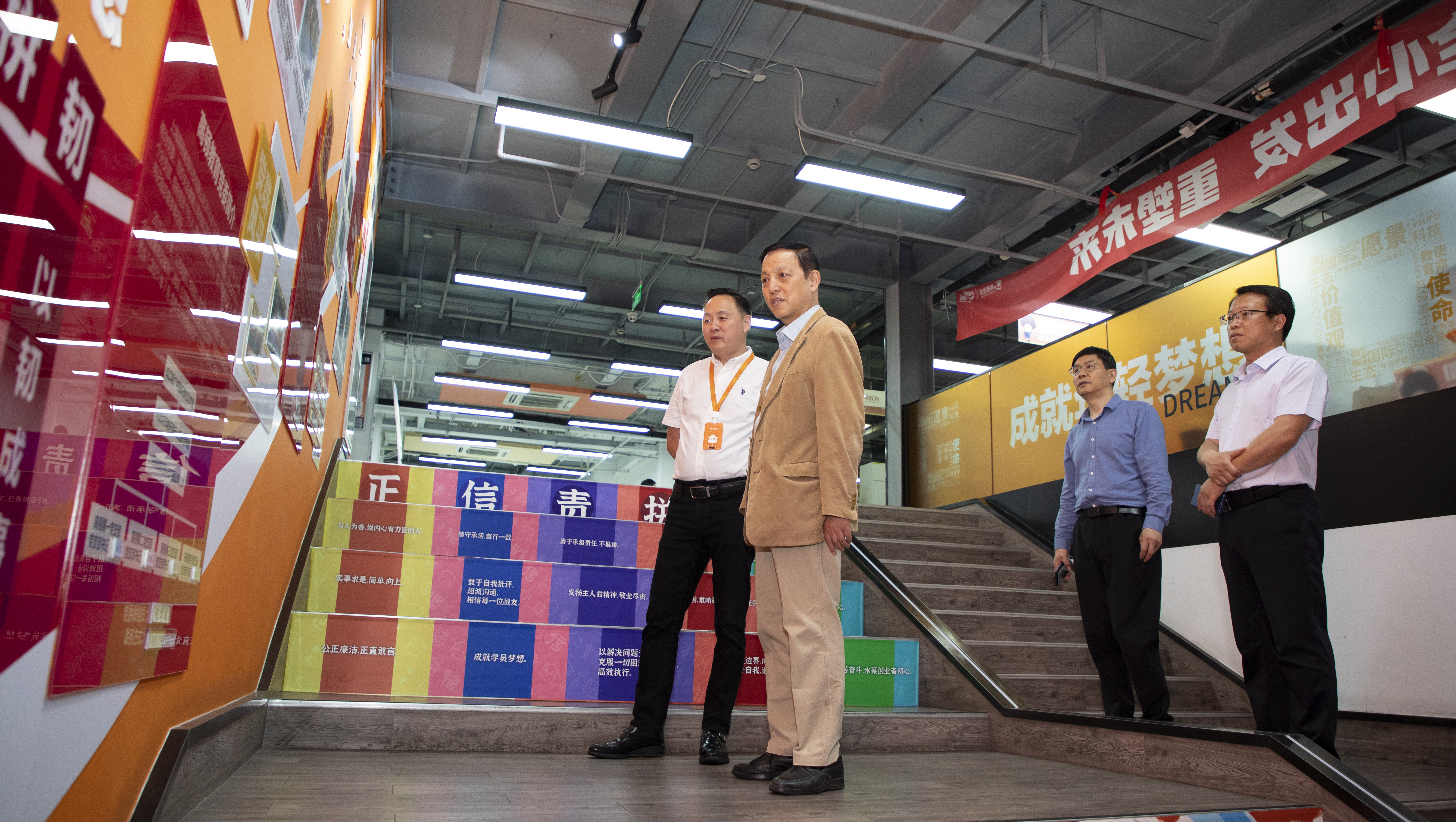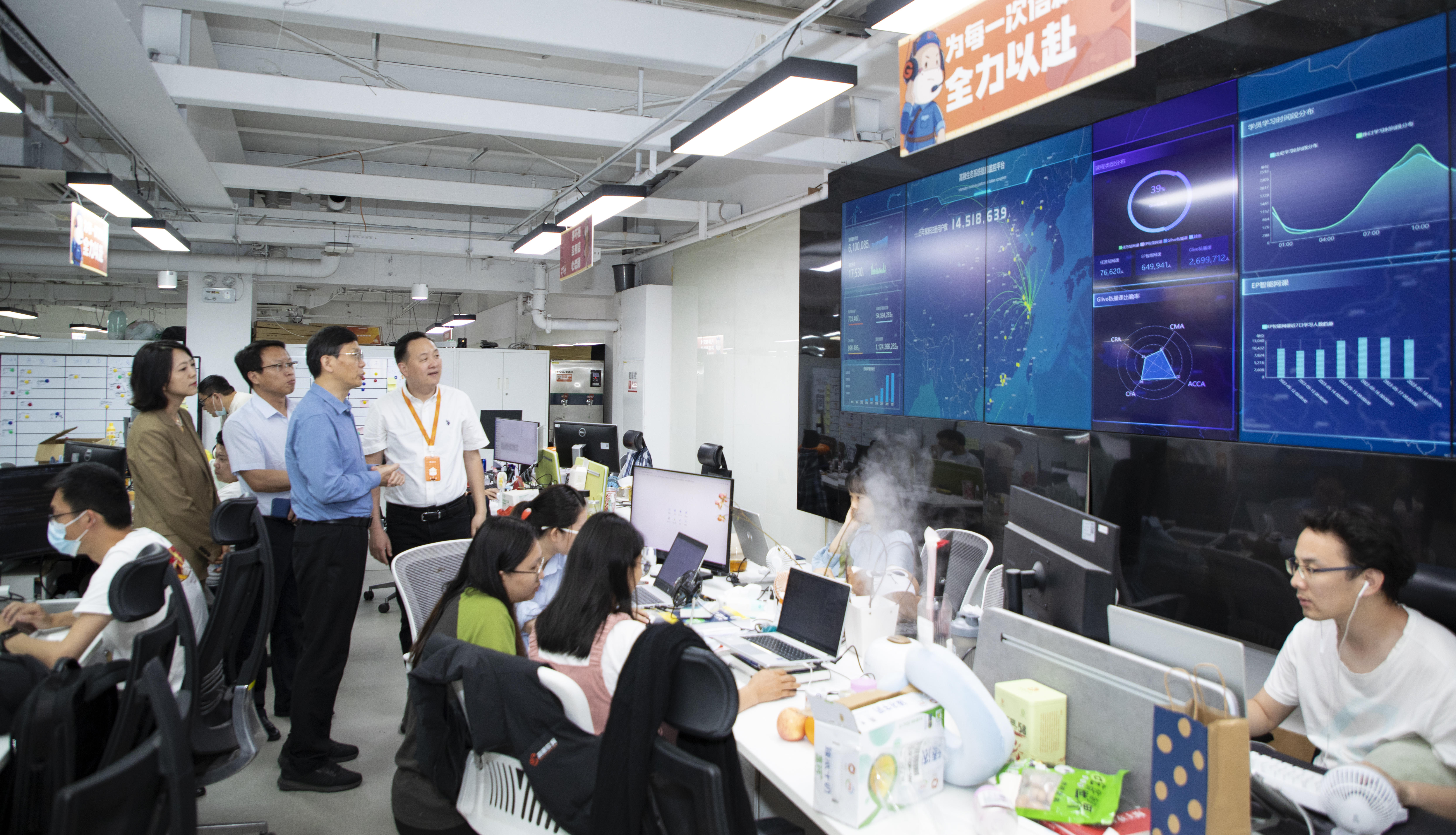 尹平副院长等一行人员首先参观了高顿总部的党建宣传大厅、双师智慧课堂、观看了智慧教育生态系统信息监控平台、智能科教平台等主要业务板块,通过实地走访,进一步了解了高顿教育的党建工作、企业文化、业务规模、科技成果等情况。