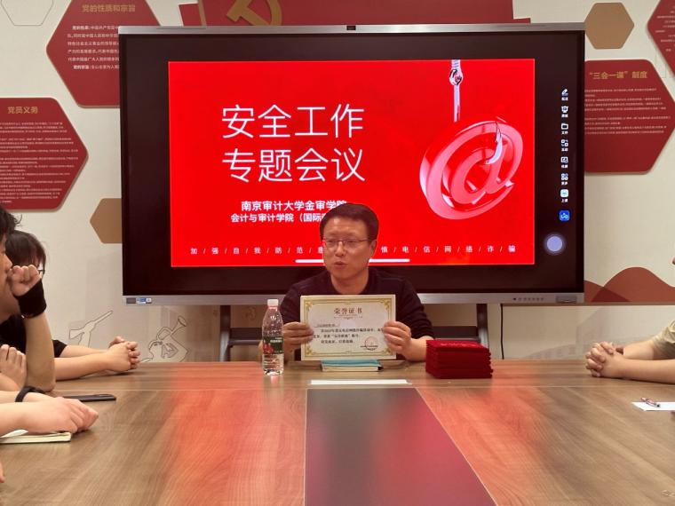 会议最后,庄老师对22级、23级在2023年度反电信诈骗活动中,获得“无诈班级“称号的班级进行表彰,并鼓励其再接再厉,积极参与反电信诈骗活动,共同营造一个无诈的校园环境。