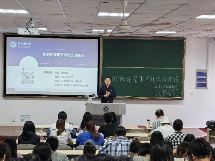 聘任仪式后,胡耘通教授以“新时代背景下审计法治建设”为题进行专题讲座。他从“新时代法治建设要求”、“审计法治建设变革”和“审计人才培养”三个方面并结合律法进行分析,帮助在座同学们深入了解了新时代背景下审计法治建设的形式。