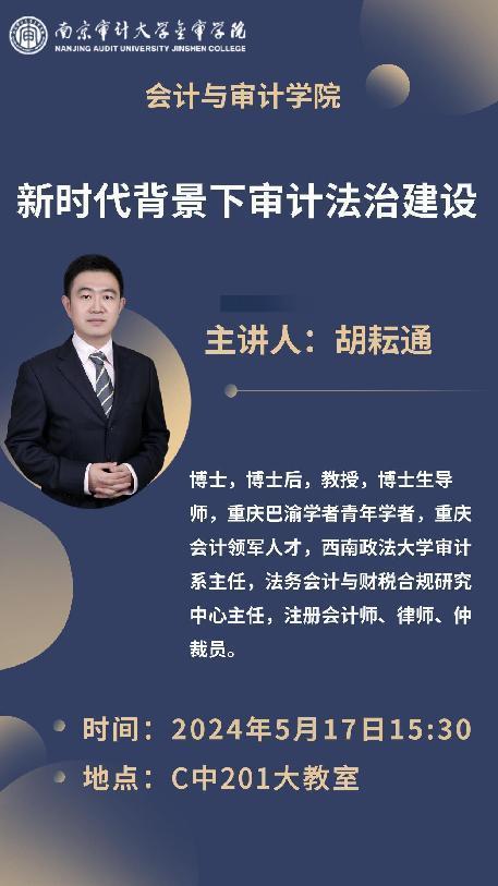 2024年5月17日下午,西南政法大学审计系主任、法务会计与财税合规研究中心主任博士生导师胡耘通教授于C中201举行“新时代背景下审计法治建设”专题讲座,williamhill党总支部书记庄怀军老师主持本次讲座。