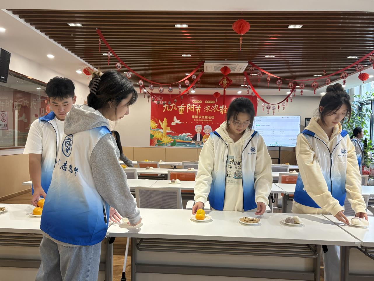 为了保证活动的顺利进行,让老人们更好地感受重阳佳节的节日氛围,志愿者们提前进行了充分的筹备工作。他们精心布置活动现场,仔细摆盘,将各式各样的零食整齐有序地摆放在桌上,营造出温馨愉快的气氛。准备过程中的每一个小细节都体现了志愿者们对老人们的细心周到和对节日的重视。
