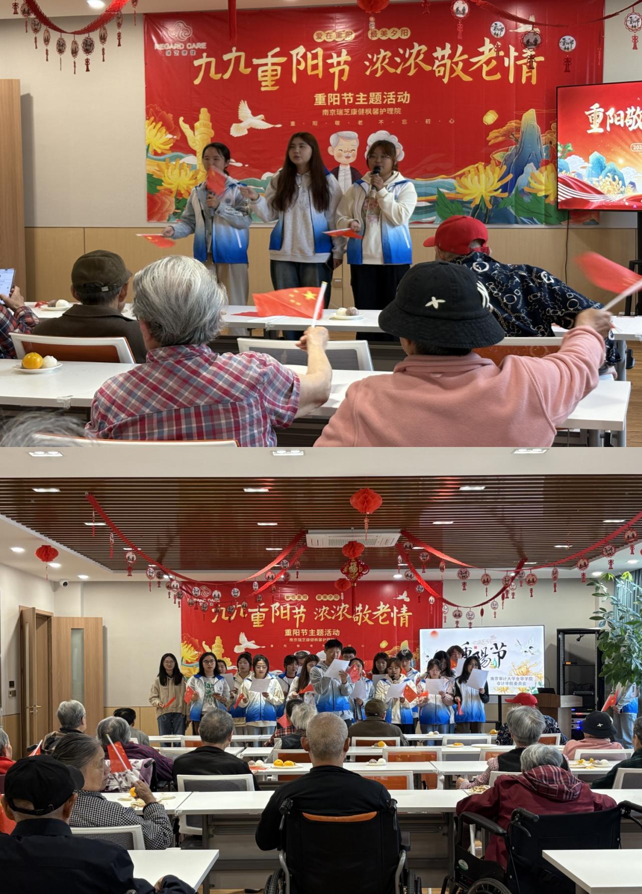 活动正式开始,在主持人激情澎湃的介绍后,志愿者们为老人们献上了丰富多彩的才艺表演。柔和的歌曲表达了志愿者们对老人们的关怀;激昂的军歌唱响了他们对祖国的热爱。最后,所有志愿者齐声合唱《歌唱祖国》,将活动推向了高潮,昂扬的歌声在护理院内回荡,激起众人心灵深处的火花,志愿者们挥动着小红旗,与老人们共同感受这份爱国情怀。