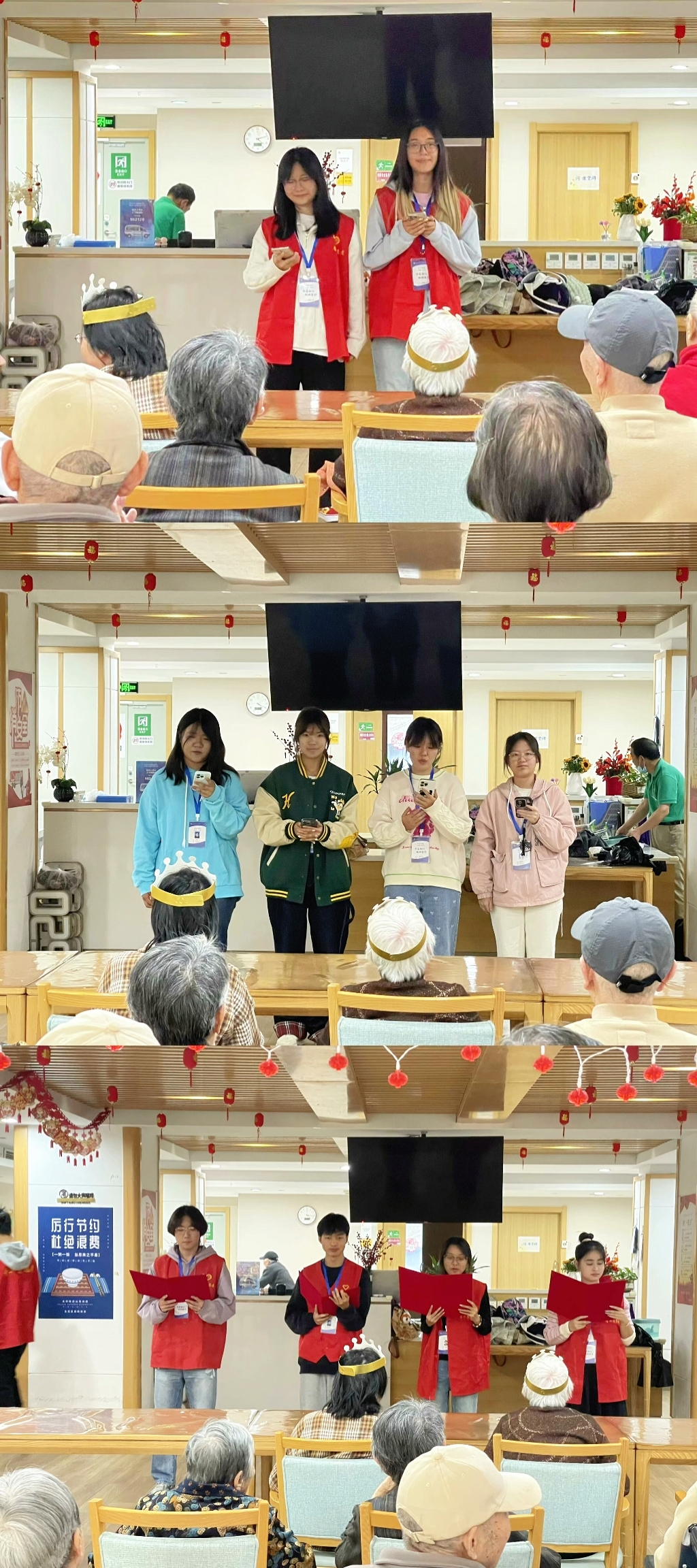 活动当天,志愿者们满怀热情地带着精心准备的生日蛋糕、鲜花、新鲜水果以及自编自导的节目,来到了高堂敬老院。老人们的脸上洋溢着幸福的笑容,眼中闪烁着期待与喜悦的光芒,他们的热情与期待让志愿者们倍感温暖。生日会在一阵阵欢声笑语中拉开帷幕。志愿者们为过生日的老人们戴上了生日帽,点燃了生日蜡烛,伴随着悠扬的歌声与热烈的掌声,老人们闭上双眼,许下了美好的心愿。随后,老人们品尝着甜美的蛋糕,与志愿者们分享着趣事与回忆,现场氛围温馨而热烈。