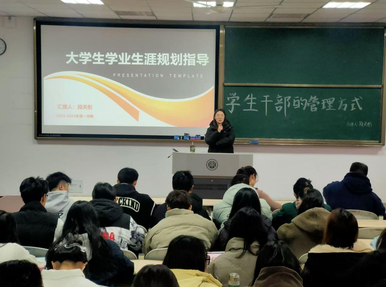 讲座伊始,段天彤老师针对学生干部能力提升的重要性进行了深入讲解,并强调:“唯有先把自己的事做好,方能更好地服务于他人。”段老师指出,学生干部需要端正思想态度,严格要求自己,以身作则,从而更好地管理班级、带领同学共同进步。随后,段老师从学业规划、职业规划、大学生活和恋爱交友四个方面展开,结合自身经验为学生干部们传授了实用的管理技巧和人生建议。她特别强调了寒暑假社会实践和参加竞赛的重要性,并详细讲解了奖学金申请及评奖评优的相关条件,激励学生干部们以身作则,争做班级楷模。同时,段老师提醒学生干部要妥善处理班级同学和宿舍成员间的关系,注重尊师重道,营造和谐的学习与生活环境。