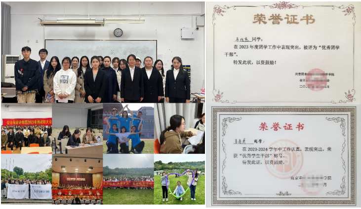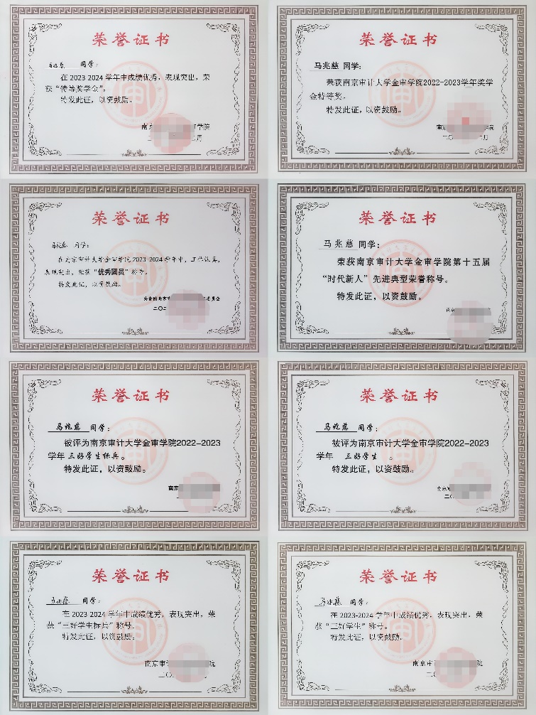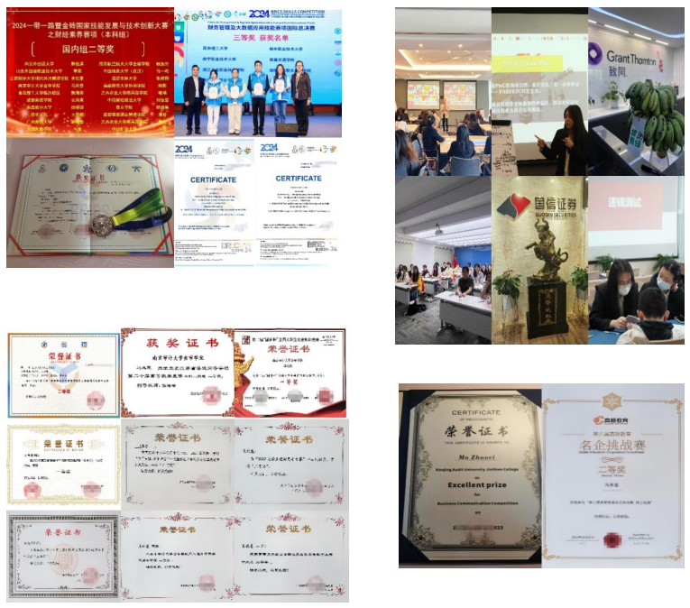 锐意进取,拓路未来。她积极参与各类竞赛,坚持“以赛促学,以赛强技,以赛提能”,通过专业竞赛巩固知识,拓宽视野。目前为止,已获国际级竞赛奖项1项、国家级竞赛奖项5项、省级竞赛2项、校级竞赛7项。如2024“一带一路”暨金砖大赛之第二届财经素养赛项全国总决赛“二等奖”(A类竞赛)、2024金砖职赛财务管理及大数据应用技能赛项国际总决赛“三等奖”(A类竞赛)、江苏省第二十届高等数学竞赛本科二级组“二等奖”、2024年“科云杯”企业税务及经营管理技能大赛“二等奖”、2024年第五届“衡信杯”个税师精英挑战赛(本科组)“一等奖”等奖项。与此同时,她也走访了普华永道(苏州分所)、致同会计师事务所(南京分所)、国信证券以及国信证券等企业,了解其工作环境、用人标准和企业文化;参加模拟面试,锻炼沟通表达能力和逻辑思维能力,并及时总结经验,发现的不足之处,明确未来职业发展方向。