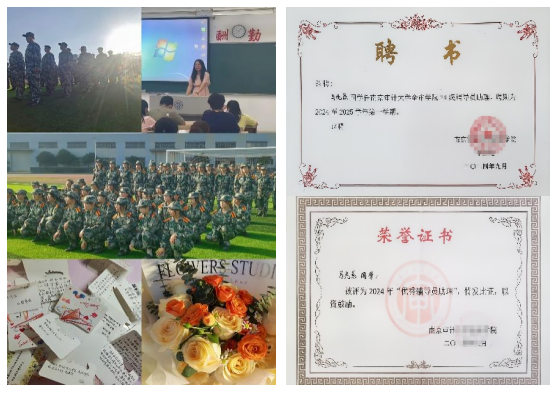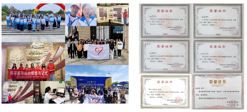 她积极参与“三下乡”活动,在2024年暑假期间,进行了以“探寻塞罕坝的辉煌与记忆”为主题的团队实践项目。最后,其团队被评为省级团队,获得校级“优秀团队”的称号,并在多个网站进行宣传,如华闻网、中国基层网、中国报道网、中华网等等。在2023年暑假期间,她参加了为期30天的政务实践,最后因表现优秀,被当地团委评为“‘返家乡’社会实践先进个人”。此外,她也积极参与学校各个社团所举办的志愿活动,认真投入南京的各个地方进行社会服务,共参与了34场志愿服务活动,包括两次迎新志愿活动、分团委学生会栖霞山志愿活动、鸡鸣寺志愿活动以及学则路整理共享单车等等。通过一次次志愿服务,她感受到了人与人之间最纯粹的温暖与善意,明白了关怀的力量,收获了成长,更加坚定了奉献的决心。