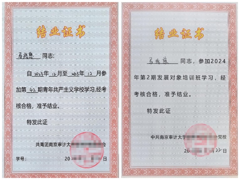 她信念坚定,向党组织不断靠拢,认真进行季度思想汇报,深入学习党的理论知识,并将理论学习转化为行动自觉,积极走进红色教育基地,感受历史的厚重与信仰的力量,坚定“听党话、跟党走”的决心,尽最大力量为人民服务。在2024年5月被评为“优秀团员”,目前已顺利于青共校和党校毕业。