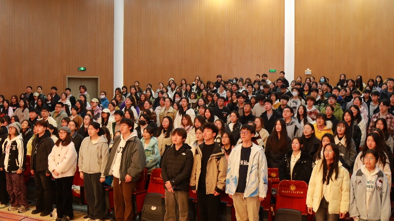 讲座最后,郭老师带领全体同学齐声诵读梁启超先生的《少年中国说》,将本次讲座气氛推上高潮。“美哉,我少年中国,与天不老!壮哉,我中国少年,与国无疆!”铿锵有力的词句响彻报告厅,观众席上同学们的赤诚热血交相辉映,形成震撼的红色海洋!