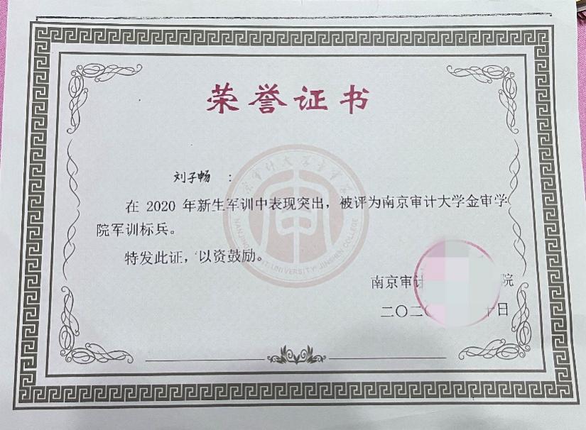 刚入学时,在新生军训中她表现出色,被评为“军训标兵”;在社团工作中,被选为国旗护卫队大型元旦晚会主持人,并参演话剧,临场随机应变,为领导和同学们带来一场视觉盛宴。同时她担任南京抗日航空烈士纪念馆志愿讲解员,课余时间学习馆内陈设解说词,绘声绘色,讲解极具感染力,使观看者身在其中;2020年12月13日,作为学生代表在此馆发言,接受了记者的采访。