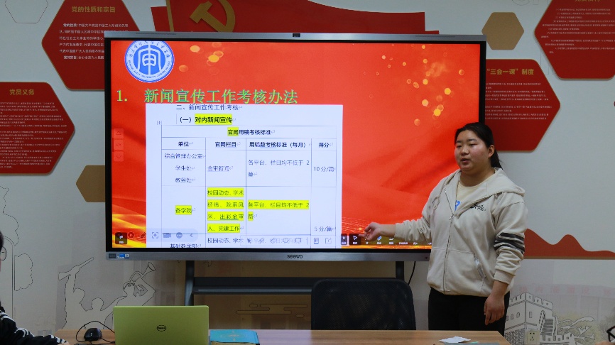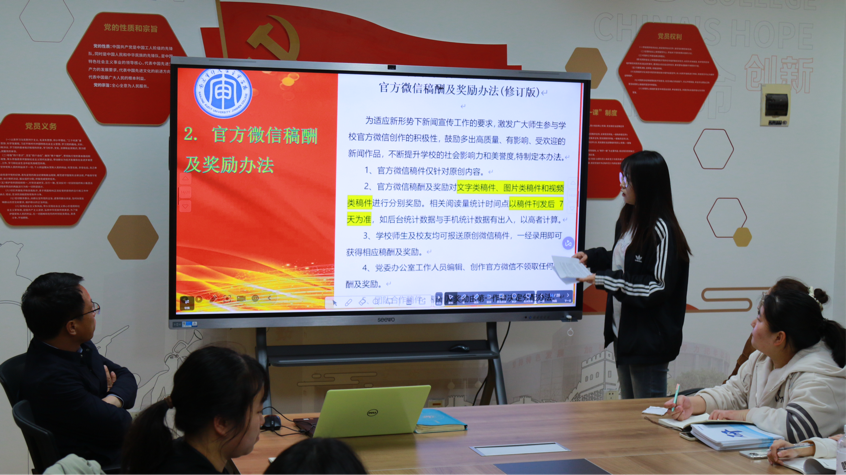 分团委副书记谢欣婷和贾智涵分别针对学校新闻宣传工作考核办法以及官方微信稿酬奖励机制进行详细解读,并激励同学们不断加强学习,以更高标准投入宣传工作。