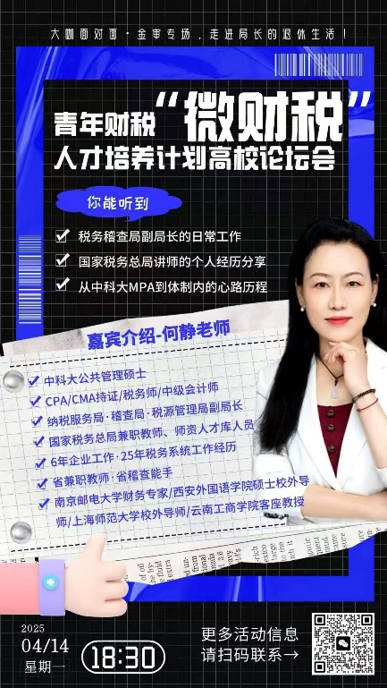 何静教授是财税领域的“多证达人”,同时拥有中级会计师、美国注册管理会计师、注册会计师、注册税务师等专业证书,还是中科大公共管理硕士,国家税务总局兼职教师、人才库人员,原某市稽查局副局长,曾任税源管理局副局长和纳税服务局副局长,历经税源管理、纳税服务、征管科等多岗位。丰富的实战经验与教学经验,使她的授课既严谨专业,又生动易懂,深受学生喜爱。