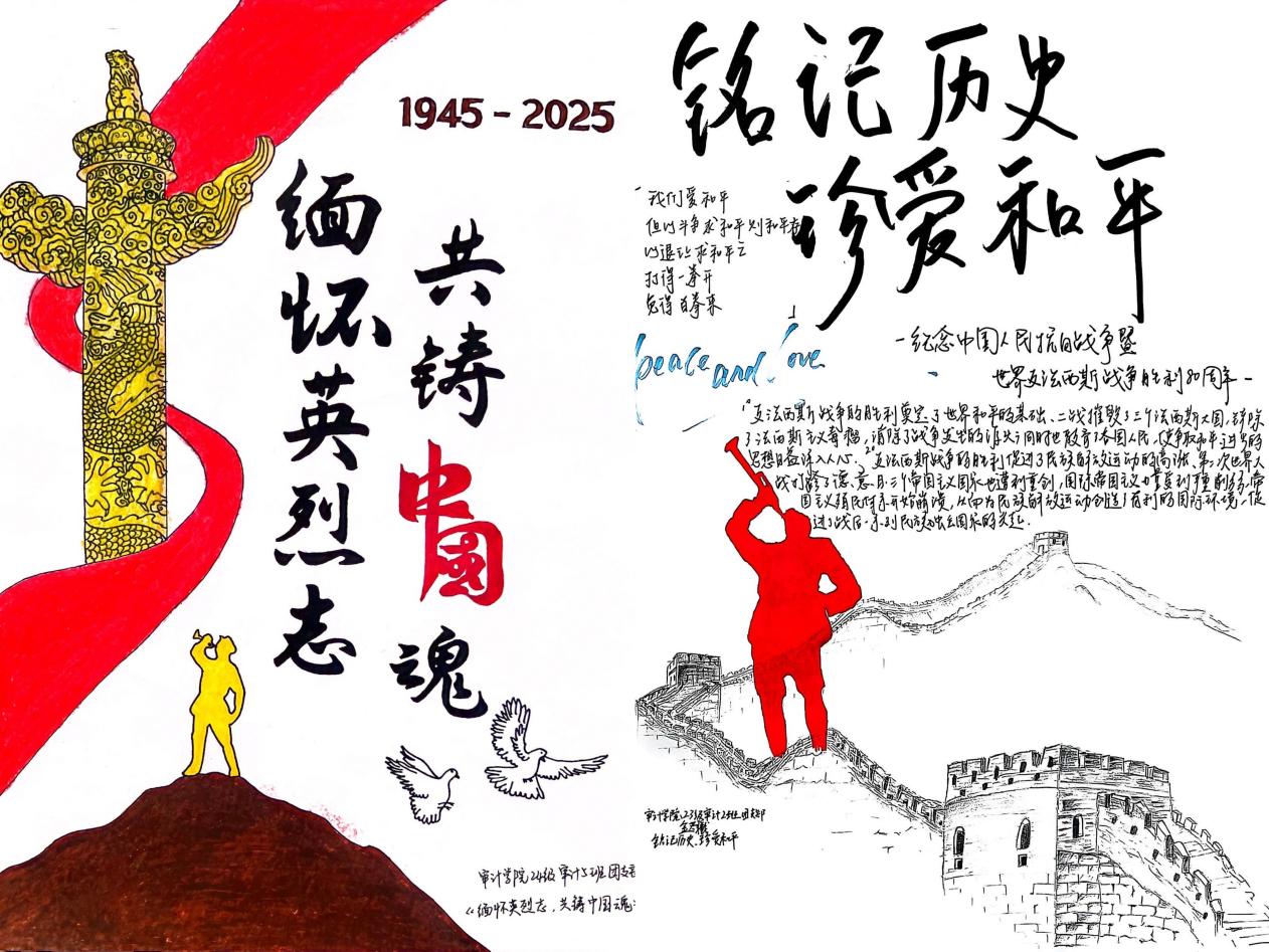 各班级团支书以“纪念抗战胜利80周年”为主题,精心设计红色海报。海报作品通过恢弘的历史场景、鲜明的英雄形象和激昂的爱国标语,再现了中华民族不屈不挠的抗战精神,激励青年学子铭记历史、砥砺前行。