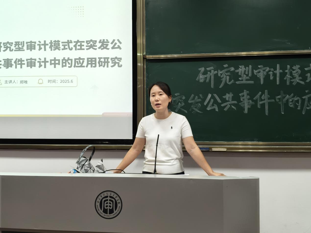 围绕研究型审计模式,郑老师从概念目标、技术特征、实践路径展开深入讲解。通过图表演示,清晰呈现出研究型审计“聚焦宏观、以对象为起点、依托大数据智能、效率导向”的技术特征;并通过结合真实案例,拆解从风险识别到效果评估的“研审融合”流程,剖析如何通过深度研究破解突发场景下审计难题。讲解中,她还融入跨学科思维,鼓励学生拓宽知识维度,为应对复杂审计任务储备能力,让学生们对研究型审计的运作逻辑有了具象化理解。