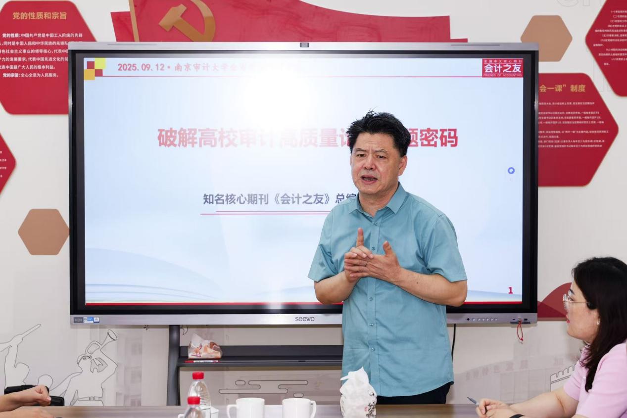 笑雪总编首先简要介绍了《会计之友》创刊40年来的发展历程与定位,并解析了期刊“三审三校”制度的核心逻辑。之后,结合近年《会计之友》收录的审计类论文案例,深入剖析了在高质量发展背景下审计论文选题的“顶天立地”原则。“顶天”即审计研究要与国家发展战略相契合,关注时代命题,使研究成果能够为国家发展提供理论支持;“立地”则强调立足中国审计实际情况,深入研究真实且具有价值的新问题,将学术研究与实际应用紧密结合。随后,笑雪总编指导师生从期刊审稿人视角,围绕7个审计参考选题展开重点研讨。他通过深入浅出的讲解,使师生们掌握了辨别选题的科学方法。最后,笑雪总编以习近平新时代中国特色社会主义思想为指引,依据国家重大战略需求、相关法律法规、政策制度要求以及当前工作重点,针对我国审计理论和实践中的热点、重点、难点问题,详细分享了论文选题的来源、方法、途径以及写作注意事项等内容。笑雪总编凭借其资深的编辑经验、生动且富有感染力的授课风格,赢得了在场师生的阵阵掌声。