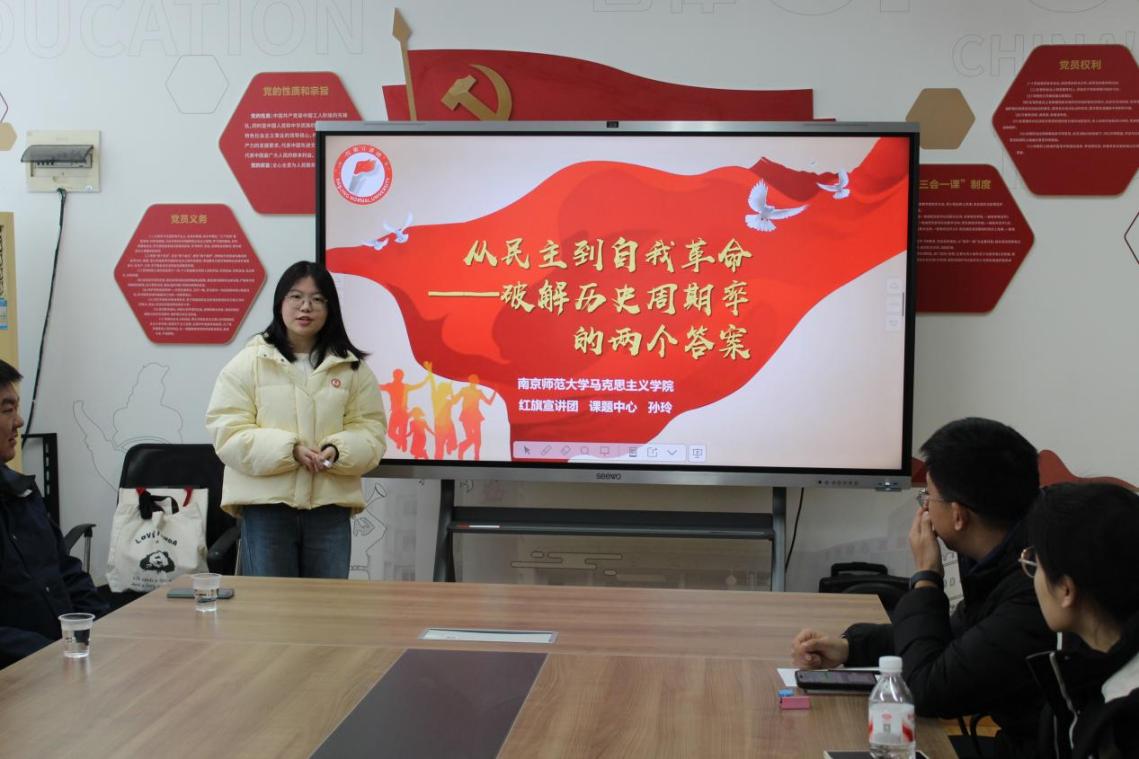 2025123日,为引导党员师生更好地理解中国共产党破解历史周期率的深邃思考与成功实践,筑牢理想信念根基。南京师范大学马克思主义学院红旗宣讲团成员——2025级思想政治教育专业硕士研究生孙玲,在栖霞区唐大姐党建工作室的携手和指导下,牵手williamhill英国中文williamhill,为党员师生送上了一堂理论联系实际的精品党课,这不单纯是党课,更是用创新的手段把仙林地区高校党建课堂活化的典型案例,值得推广宣传。本次活动由学院30余名党员、发展对象、积极分子代表共同参与。
