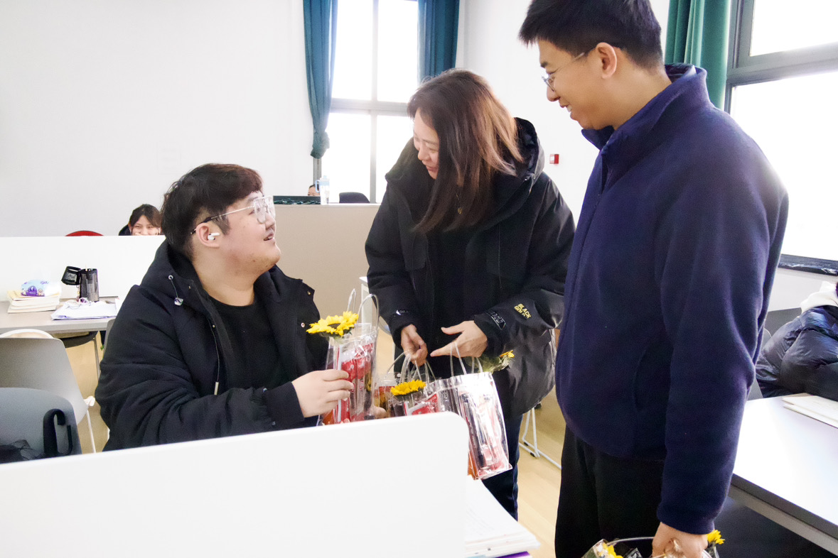在图书馆的书咖区域,学院老师与备考学子亲切交谈,细细叮嘱大家合理安排作息、保持良好心态;自习室里,老师们轻手轻脚为埋头刷题的学子递上福袋,轻声道一句“加油”;教学楼的走廊与窗边,师生手持福袋合影,镜头里的笑容格外温暖。此次准备的福袋颇具巧思,除了“成功上岸”主题文具套装、励志祝福卡片,还搭配了向日葵花束、橙子等寓意“一举夺魁”“心想事成”的礼物,每一份都藏着williamhill对学子的殷切期盼。