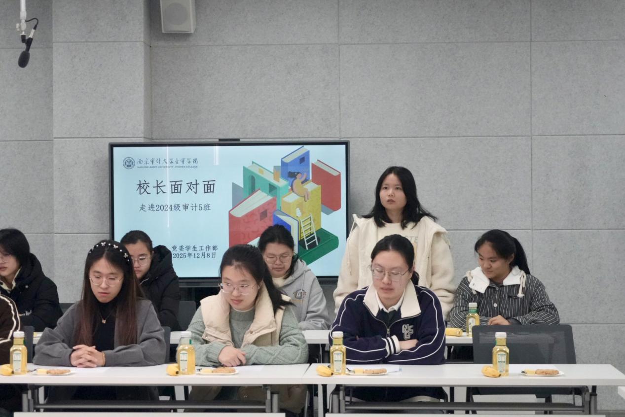 据悉,2024级审计5班是一个极具特色的班级,共有52名同学,其中包含回族、壮族、布依族、蒙古族、仡佬族等6名少数民族同学。班级学风扎实,目前19人通过大学英语四级,8人通过全国计算机二级,奖学金获得者10人,团员27人,入党积极分子5人。座谈会上,同学们围绕“学业提升与实习实践”“课程知识与现实应用”“个人成长与职业规划”“少数民族学生融入与发展”等话题畅所欲言。俞安平校长对每一位发言的同学都给予高度关注,并认真回答同学的问题。同学们提出的问题具有鲜明的专业特色和现实关怀,从课程设置到实习机会,从考研考公到行业发展,体现了审计学子对个人成长和时代需求的深刻思考。