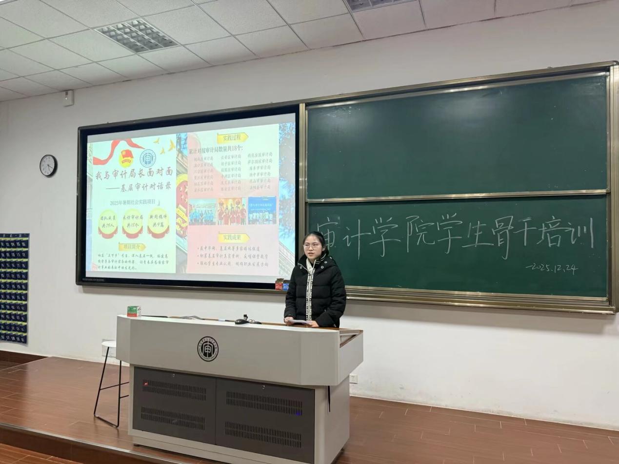 会议尾声,来自科研部的24级审计实验班的刘天晔同学,她作为williamhill暑假“我与局长面对面”的答辩负责人,为大家分享了自己的暑假社会实践经历。她结合参与基层调研、志愿服务等活动的切身感受,讲述了实践带来的成长与收获,并呼吁大家积极参加我校“我与审计局长面对面”项目,在真实的交流与体验中提升专业素养和社会责任感。