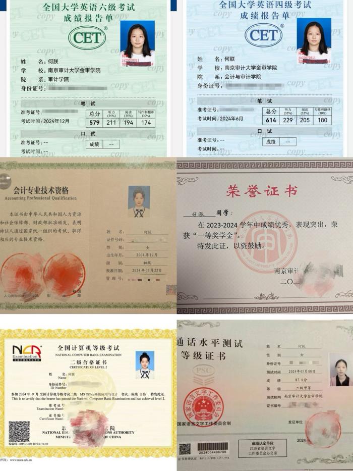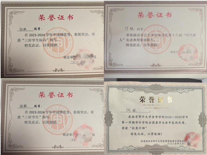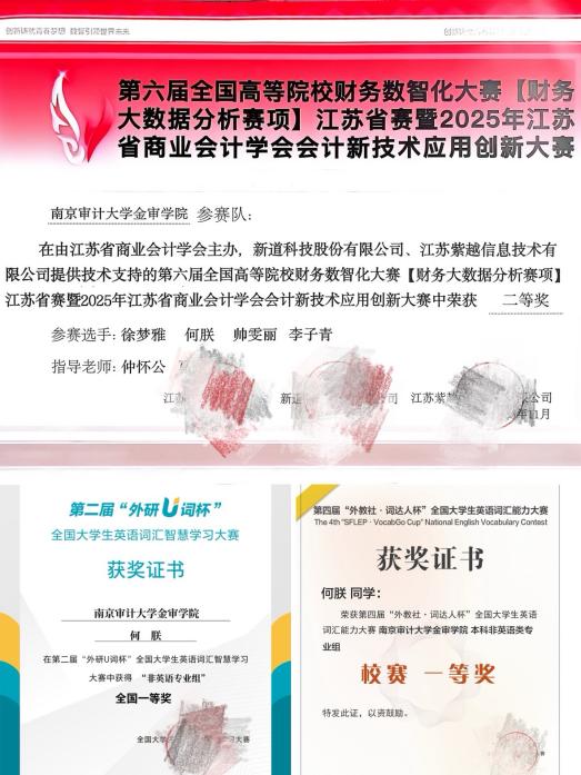 何朕,共青团员,2004年12月生,江苏南京人,23级审计实验班学生,现任学生会主席等职,曾任学生会秘书处部长。入学以来先后获得“优秀团学干部”“三好学生标兵”“一等奖学金”“时代新人”“先进工作者”“U词杯全国一等奖”“暑期社会实践先进个人”等荣誉,所在班级荣获“优良班风班”等荣誉。目前已通过大学英语四六级、全国计算机二级等级考试、初级会计专业技术资格考试、普通话专业等级测试等考试。