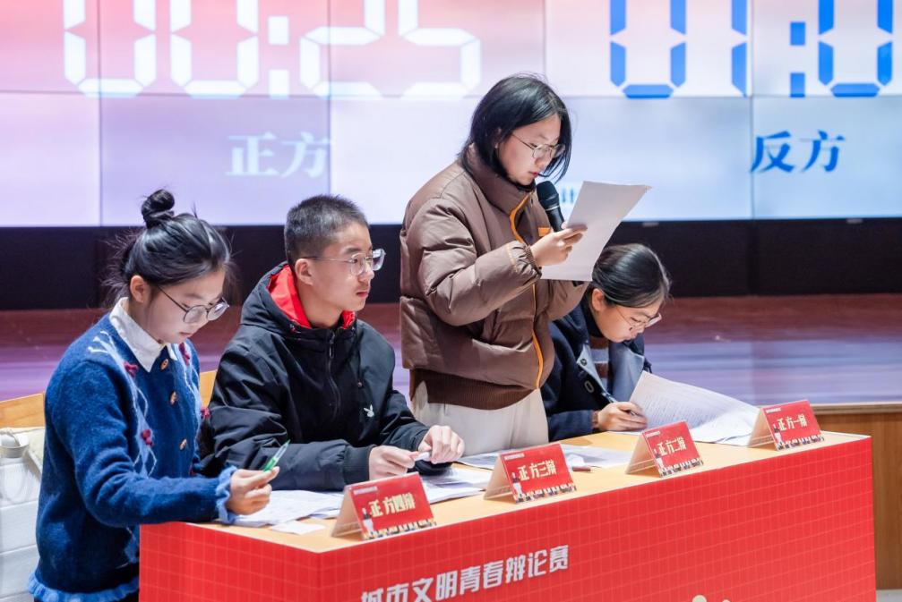 冒树怡同学作为正方辩手,阐述了“城市文明侧重引导公民自觉”的观点。她在发言中指出,外部的规范只有内化为自觉行为,才能具有持久性和生命力,才能真正实现“城市,让生活更美好”的愿景。评委给予很高评价,经过正反双方的激烈辩论,调研组认为,引导与规范并非二元对立,而是城市文明建设的“两翼”,如同车之双轮、鸟之两翼,缺一不可。