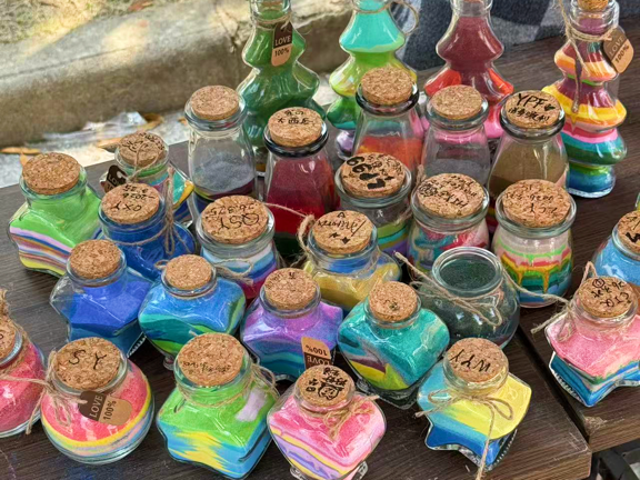 同学们手持工具,将不同颜色的彩砂通过漏斗精心堆叠入瓶中,创造出独一无二的“彩虹”层次,还有人巧妙地点缀上干花、亮片等小装饰。大家或全神贯注于自己的作品,或愉快地交流配色心得,在欢声笑语中享受着创作带来的纯粹快乐。