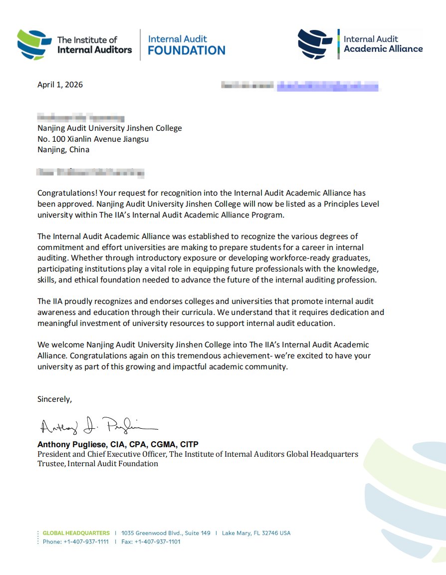 此次成功加入IAAA学术联盟,标志着学校在内部审计专业建设、人才培养质量和国际化办学水平等方面获得国际权威专业组织认可,也彰显了学校在内部审计教育领域的持续积累与办学实力。